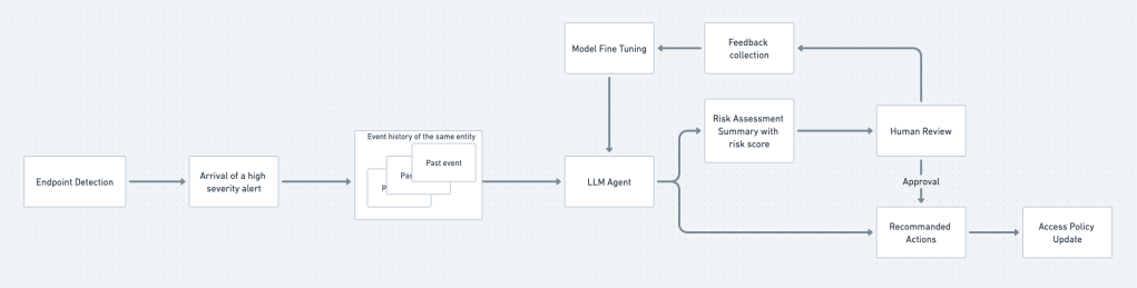 The idea is that whenever we receive an alert of high severity event about an endpoint, we retrieve a history of event of the same endpoint, with some preprocessing to only keep the most relevant information. Then we send this event history to the LLM for risk assessment and action recommendations. Human review is still necessary at the beginning, or for new type of cases, to confirm model’s output, or give human analysts’ opinions when they disagree. The results of human review will be collected, organized, and used to fine tuning the model in the future for better performance. Eventually, the model can automatically filter out most noises, and only prompt for human review for high risk cases with high confidence. The following chart illustrates the basic work flow.