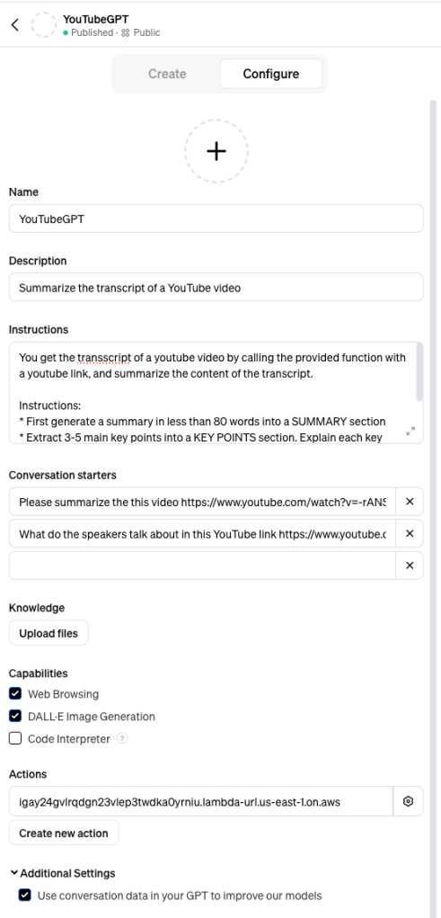 GPTs is a new product released by OpenAI, which allows developers to build custom chat bot with specific prompts and private knowledge library. It also integrates OpenAI’s function calling capability. In fact, each GPT is an agent that understands the context of the conversation and performs appropriate actions when needed. In this article, I will explain how I built the YouTubeGPT with function calling. This GPT will extract transcript from a YouTube video and summarize it.