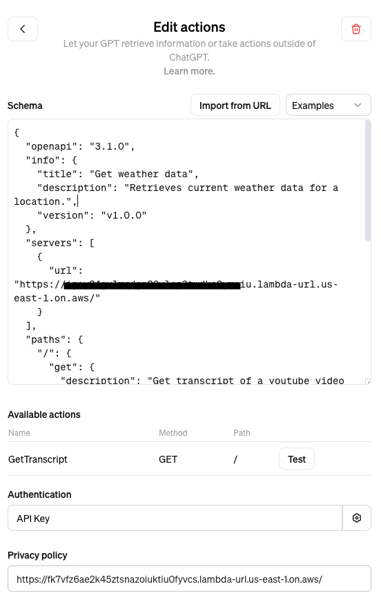 In the case of YouTubeGPT, what I need is a web endpoint which return a video’s transcript given its YouTube link. I implemented this API with an AWS Lambda, leveraging the python library youtube_transcript_api. This is actually the main part of the work which took most of my development time. However, because building Lambda is not the focus of what we are discussing here, I’d skip this process.