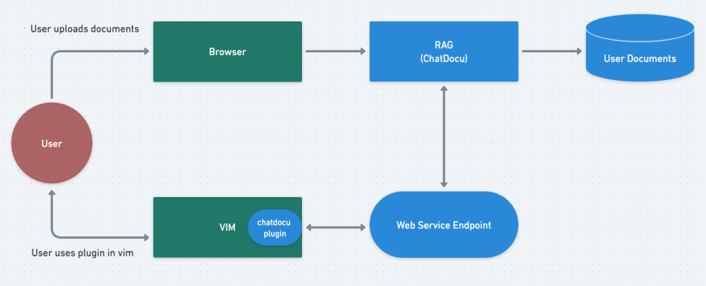 4. This is the most complex part. Create a “chatdocu” vim plugin, and define an “:Ask” command for it. When user types “:Ask” in vim’s command mode, the plugin will collect user’s question after :Ask, and send it to the web service endpoint created in step 3. Then after it receives answer, it will insert the answer into vim’s current buffer.