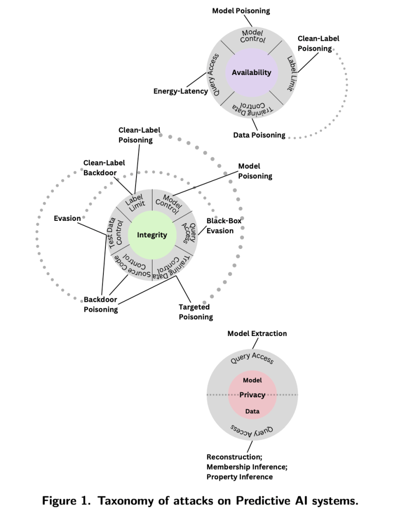 The document outlines a taxonomy of adversarial machine learning attacks against Predictive AI (PredAI) systems, identifying major attack types based on the attacker’s objectives: Availability breakdown, Integrity violations, and Privacy compromise. The attacks are further classified based on the capabilities required to execute them. Major attack types against PredAI systems include: