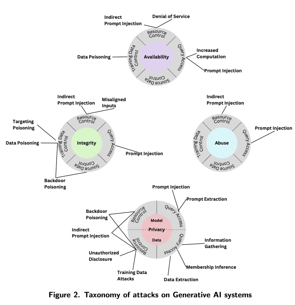 Among these attacks, Prompt Injection attacks are particularly relevant to GenAI systems and can be categorized further based on their exact nature (direct, indirect, through resource control, etc.). Other attacks such as Data Poisoning and Backdoor Poisoning directly target the data used for training the models or attempt to insert malicious functionality. Privacy-related attacks focus on extracting or inferring sensitive information from the model or its training data.